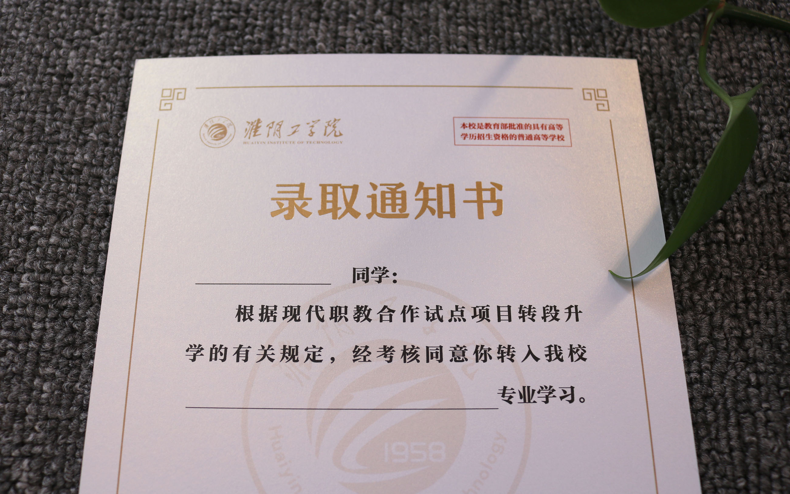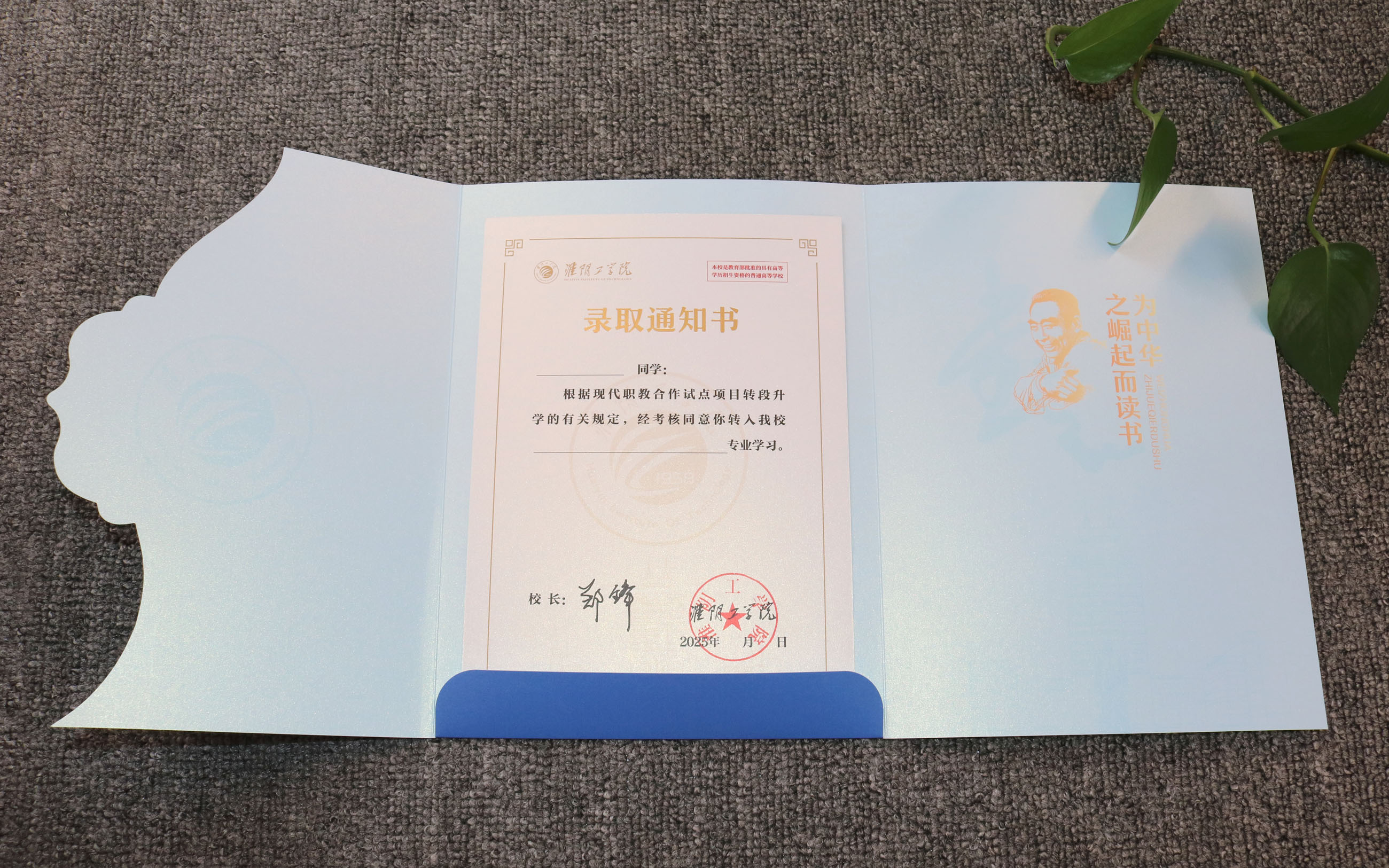 专业承接淮阴工学院2025年录取通知书印刷!针对职教转段升学群体定制,清晰呈现院校资质、校训标语,严控印刷质量与纸张质感,杜绝模糊错漏。支持版式/烫金等工艺定制,同步承接招生简章、校园画册;高校印刷全程省心!